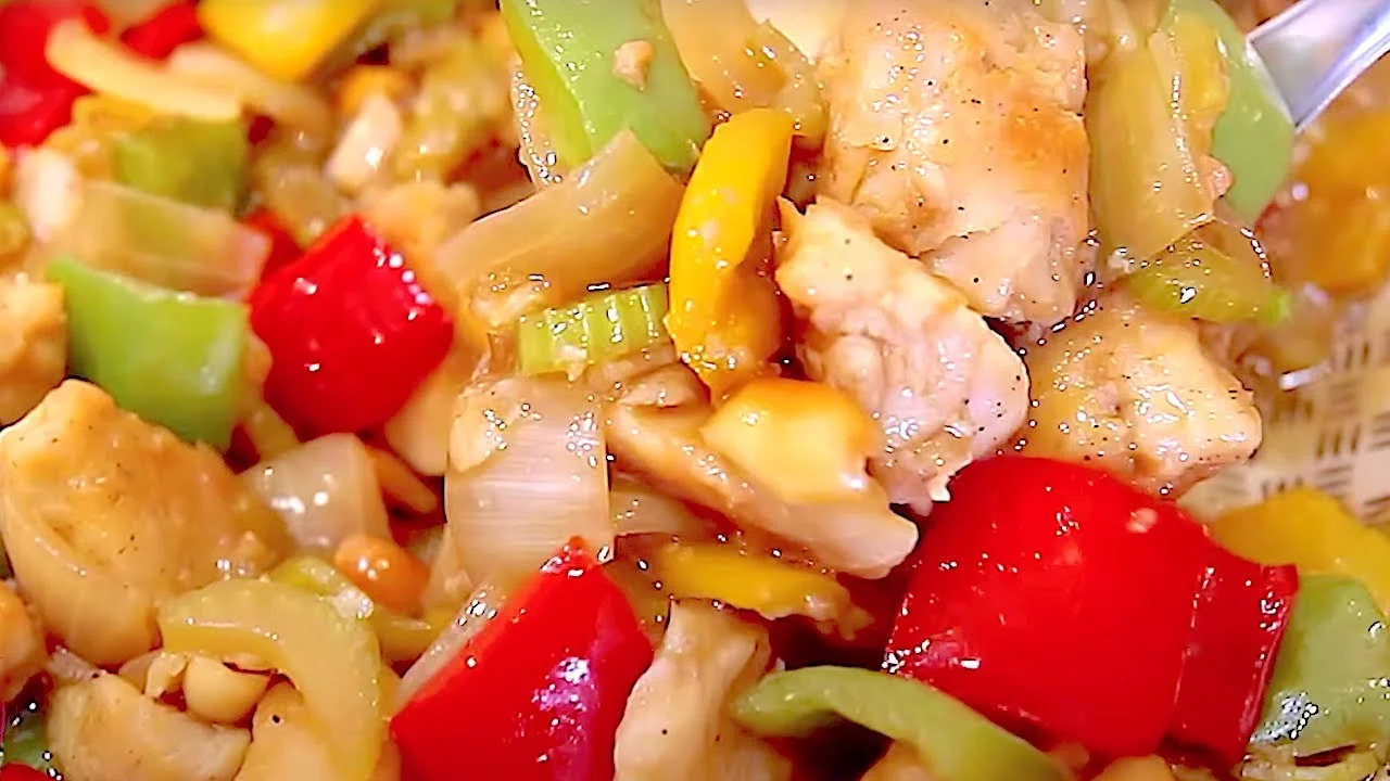 Eu adoro pratos agridoces, e o que eu mais gosto nesse a combinação do frango picado, pimentão e amendoim.